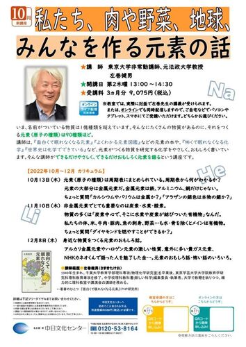 【左巻健男:名古屋でカルチャーセンターの講師10月13日~】 栄中日文化センター(名古屋)で「みんなをつくる元素の話」講座の講師。 *教室で受講する以外にもオンラインでの受講も可能。 *1回目10月13日・2回目11月10日・3回目12月8日(第2木曜 13:00~1…